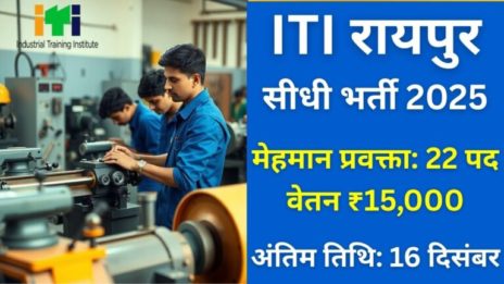 ITI Raipur Guest Lecturer Recruitment 2025: छत्तीसगढ़ के रायपुर जिले (सड्डू, माना, हीरापुर आदि) में मेहमान प्रवक्ता के 22 पदों पर भर्ती निकली है।...