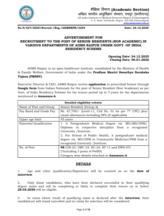 AIIMS Raipur Recruitment 2026: एम्स रायपुर में 100 सीनियर रेजिडेंट पदों पर भर्ती 2025
