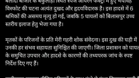 रायपुर, बलौदा बाजार जिले के बकुलाही स्थित स्पंज आयरन फैक्ट्री में हुए भीषण विस्फोट की घटना को मुख्यमंत्री श्री विष्णु देव साय ने अत्यंत दुखद एवं...