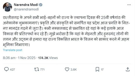 रायपुर 1 नवंबर 2025, प्रधानमंत्री श्री नरेन्द्र मोदी ने छत्तीसगढ़ के 25वें स्थापना दिवस के अवसर पर राज्य के लोगों को शुभकामनाएँ दी हैं। ...