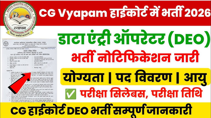 CG Vyapam Data Entry Operator Bharti 2026 : छत्तीसगढ़ व्यापम (CG Vyapam) द्वारा छत्तीसगढ़ उच्च न्यायालय बिलासपुर के अंतर्गत डाटा एंट्री ऑपरेटर (HDEO26) पदों पर भर्ती हेतु आधिकारिक नोटिफिकेशन जारी कर दिया गया है। इच्छुक एवं योग्य अभ्यर्थी ऑनलाइन माध्यम से आवेदन कर सकते हैं। आवेदन प्रक्रिया 20 अप्रैल 2026 से शुरू हो चुकी है।