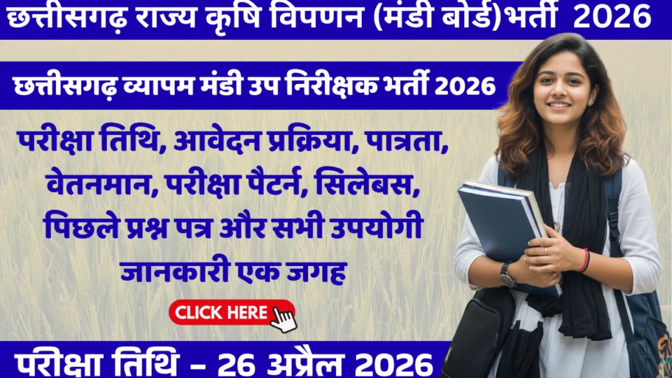 CG Vyapam Mandi Nirikshak Bharti 2026: छत्तीसगढ़ के लाखों सरकारी नौकरी की तलाश कर रहे युवाओं के लिए CG Vyapam Mandi Nirikshak Bharti 2026 एक बहुप्रतीक्षित और सुनहरा अवसर है। यह भर्ती विशेष रूप से छत्तीसगढ़ राज्य कृषि विपणन (मंडी बोर्ड) के अंतर्गत मंडी उप निरीक्षक (Mandi Sub Inspector) के प्रतिष्ठित पदों के लिए आयोजित की जा रही है। यह भर्ती उन सभी स्नातक युवाओं के लिए एक विशेष मौका है जो राज्य सेवा में अपना करियर स्थापित करना चाहते हैं और एक स्थायी और सम्मानित पद की तलाश में हैं। छत्तीसगढ़ व्यापम (CG Vyapam) द्वारा आयोजित इस परीक्षा का मुख्य लक्ष्य राज्य की मंडियों में अनुशासन, पारदर्शिता और प्रभावी प्रशासन सुनिश्चित करने के लिए सक्षम अधिकारियों का चयन करना है। इस विस्तृत लेख में, आपको इस महत्वपूर्ण भर्ती से जुड़ी हर जानकारी—जैसे परीक्षा तिथि, आवेदन प्रक्रिया, पात्रता, वेतनमान, परीक्षा पैटर्न, सिलेबस, पिछले प्रश्न पत्र और सभी उपयोगी लिंक—विस्तार से प्रदान की जाएगी।