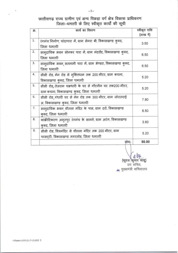 कुरुद :कुरुद विधानसभा के जनप्रिय विधायक, श्री अजय चन्द्राकर जी की सक्रियता और विशेष प्रयासों से कुरुद विकासखंड के विभिन्न ग्रामों के लिए “छत्तीसगढ़ राज्य अन्य पिछड़ा वर्ग विकास प्राधिकरण योजना” के अंतर्गत ₹50,00,000 (पचास लाख रुपये) के विभिन्न महत्वपूर्ण निर्माण कार्यों की स्वीकृति प्राप्त हुई है।