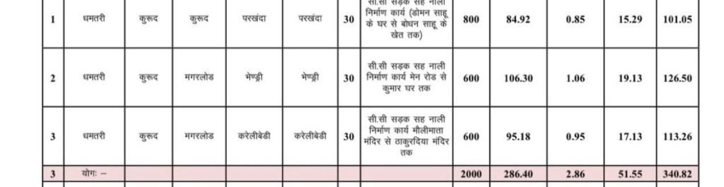 कुल योग: धमतरी जिले में इन कार्यों के लिए कुल 340.82 लाख रुपये की लागत से 2000 मीटर (2 कि.मी.) सड़क और नाली का निर्माण किया जाएगा ।