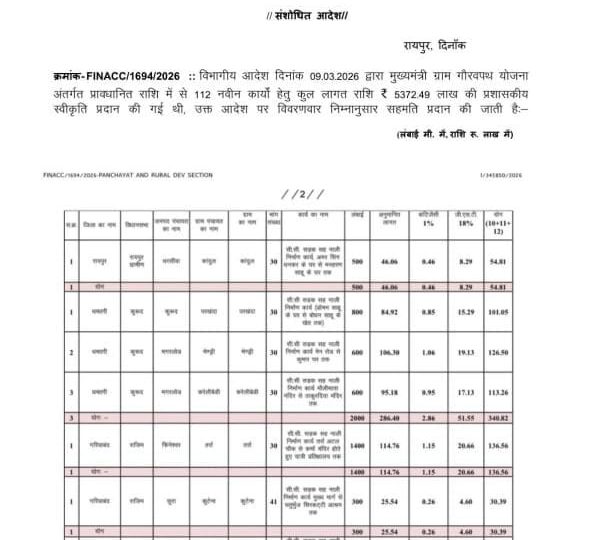Dhamtari : कुरुद क्षेत्र के विकास और ग्रामीणों की सुविधा को प्राथमिकता देते हुए विधायक के विशेष प्रयासों से कुरुद विधानसभा क्षेत्र के अंतर्गत विभिन्न ग्रामों में विकास कार्यों के लिए बड़ी प्रशासकीय स्वीकृति प्राप्त हुई है। छत्तीसगढ़ शासन के पंचायत एवं ग्रामीण विकास विभाग द्वारा जारी आदेश के अनुसार, मुख्यमंत्री ग्राम गौरवपथ योजना के तहत कुरुद और मगरलोड क्षेत्र में सी.सी. सड़क सह नाली निर्माण के लिए करोड़ों की राशि आवंटित की गई है।