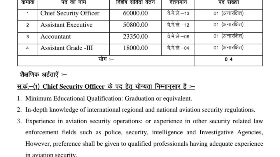 - अधिसूचना के अनुसार, एयरपोर्ट के संचालन और प्रबंधन से जुड़े विभिन्न कार्यों के लिए संविदा आधार पर कर्मियों की आवश्यकता है।