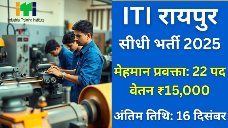 ITI Raipur Guest Lecturer Recruitment 2025: छत्तीसगढ़ के रायपुर जिले (सड्डू, माना, हीरापुर आदि) में मेहमान प्रवक्ता के 22 पदों पर भर्ती निकली है। अंतिम तिथि 16 दिसंबर 2025 है। वेतन ₹15,000 तक।