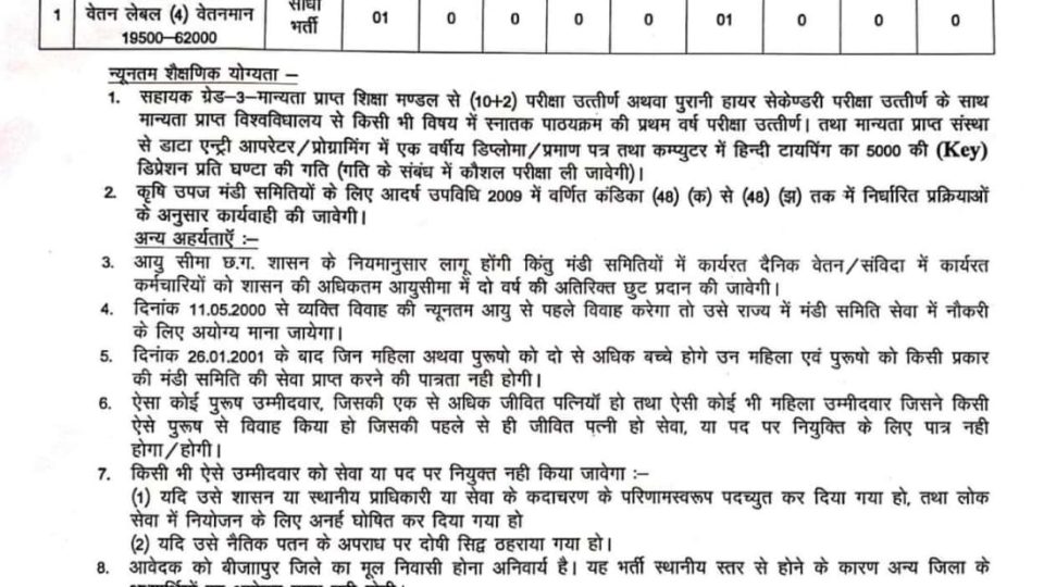 - आयु: छत्तीसगढ़ शासन के नियमानुसार। मण्डी समिति के दैनिक वेतन/संविदा कर्मचारियों को अधिकतम आयु सीमा में 2 वर्ष की अतिरिक्त छूट दी जाएगी।