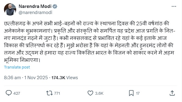 प्रधानमंत्री ने एक्स (X) पर लिखा- ‘छत्तीसगढ़ के अपने सभी भाई-बहनों को राज्य के स्थापना दिवस की 25वीं वर्षगांठ की अनेकानेक शुभकामनाएँ। प्रकृति और संस्कृति को समर्पित यह प्रदेश आज प्रगति के नित-नए मानदंड गढ़ने में जुटा है। कभी नक्सलवाद से प्रभावित रहे यहां के कई इलाके आज विकास की प्रतिस्पर्धा कर रहे हैं। मुझे भरोसा है कि यहां के मेहनती और हुनरमंद लोगों की लगन और उद्यम से हमारा यह राज्य विकसित भारत के विजन को साकार करने में अहम भूमिका निभाएगा।’