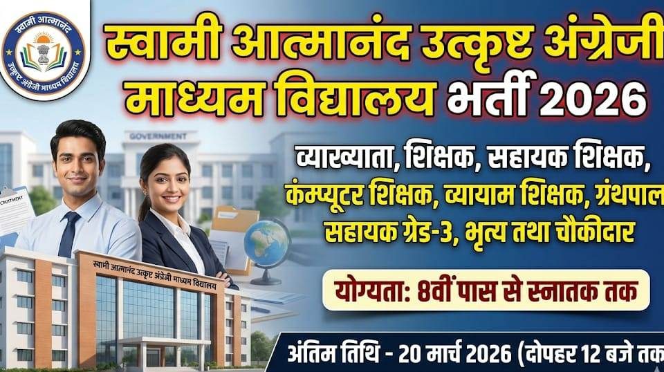 Raipur Swami Atmanand School Bharti 2026: छत्तीसगढ़ के युवाओं के लिए स्वामी आत्मानंद उत्कृष्ट अंग्रेजी माध्यम विद्यालय भर्ती 2026 एक शानदार अवसर लेकर आई है। यदि आप शिक्षक या अन्य शैक्षणिक पदों पर सरकारी वातावरण में काम करना चाहते हैं, तो यह लेख आपके लिए बेहद उपयोगी है। इस ब्लॉग में आपको भर्ती से जुड़ी हर महत्वपूर्ण जानकारी सरल भाषा में मिलेगी — जैसे कुल पद, योग्यता, आयु सीमा, वेतन, चयन प्रक्रिया, आवेदन प्रक्रिया, आवश्यक दस्तावेज और महत्वपूर्ण निर्देश। आवेदन करने से पहले पूरी जानकारी जानने के लिए इस लेख को अंत तक अवश्य पढ़ें।