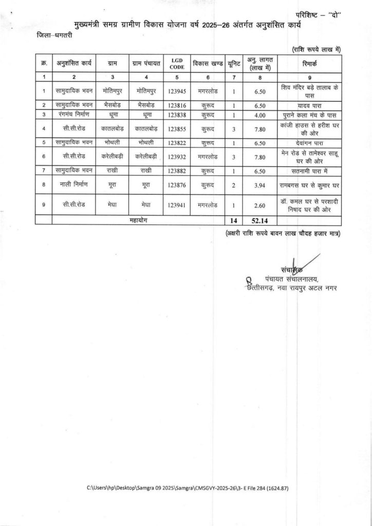 विधायक अजय चंद्राकर की अनुशंसा पर स्वीकृत किए गए कार्यों में मुख्य रूप से सीसी रोड सीसी नाली निर्माण, सामुदायिक भवन, रंगमंच और अन्य बुनियादी आवश्यकताएं शामिल हैं। स्वीकृत राशि का वितरण कुछ इस प्रकार है: